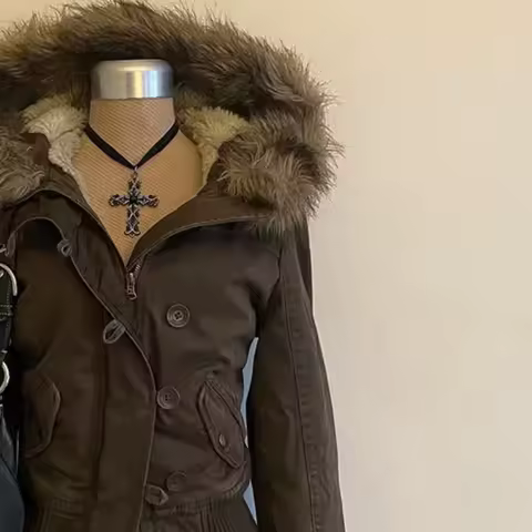 Y2k retro brown slim women jacket Harajuku street casual fur collar button zipper women jacket denim jacket women