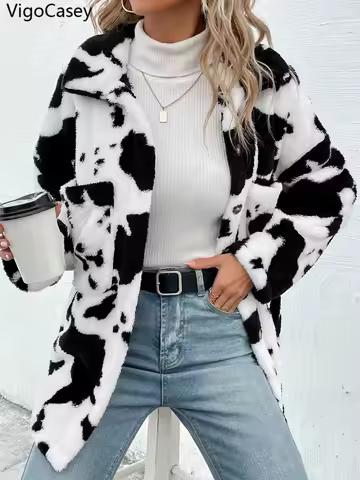 VigoCasey 2025 Female Autumn Print Jacket Women Single Breasted Thick Plush Warm Coat Winter Long Sleeve Loose Lady Soft Coat