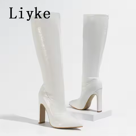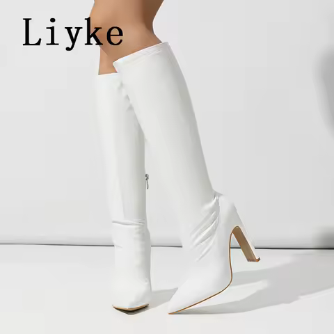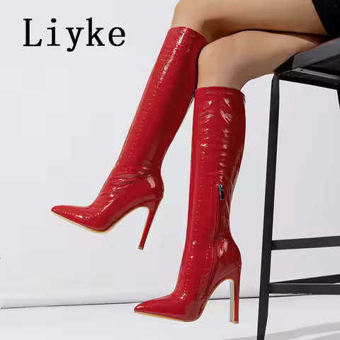 Liyke Autumn Winter Knee High Boots Women Black Snake Print Leather Pointed Toe Party Stripper High Heels Zip Long Shoes Female