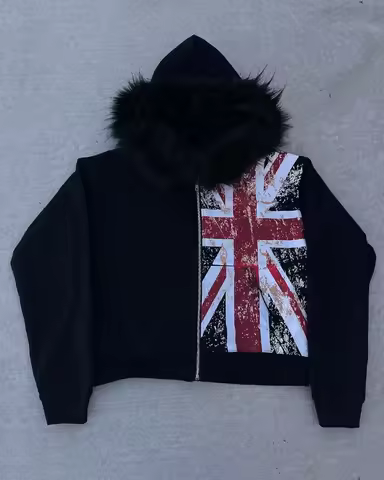 American Retro Fur Collar Flag Printing Oversize Zipper Hoodie Men's and Women's Y2K New Harajuku Hip Hop Goth Casual Sweatshirt