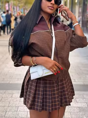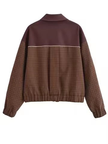 Fashion Woman Long Sleeve Plaid Splicing Loose Jacket Women Turn Down Collar Zipper Side Pockets Brown Chic Casual Coat