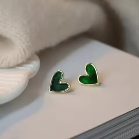 Cute Korean Earrings Heart Bling Zircon Vintage Dark Green Versatile Gold Color Earring for Women Fashion Jewelry 2024 New Gift
