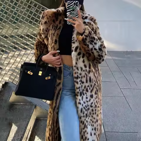 Fashion Winter Long Warm Thick Leopard Fluffy Faux Fur Coat Women Tiger Print Runway Loose Luxury Designer Clothing Windbreaker