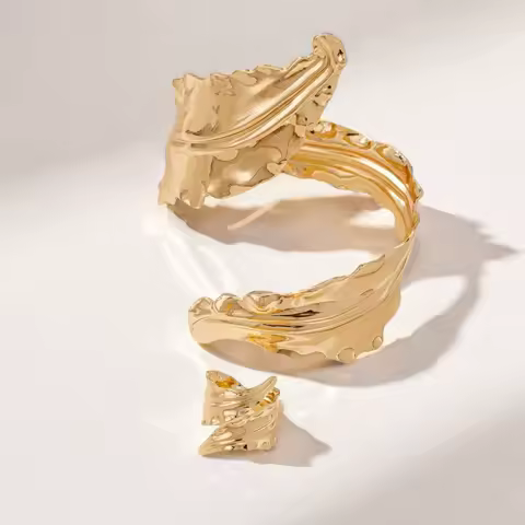 Vintage Fashion Folded Leaf Bracelet Spiral Opening Adjustable Ring Set For Women Girls Holiday Party Fashion Jewelry BS031