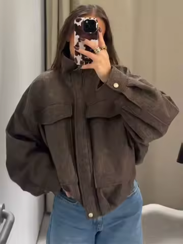 Women's Bomber Jacket Autumn 2025 New Stand Collar Lantern Sleeve Big Pocket Zipper Oversized Winter Coats Chic Ladies Outerwear