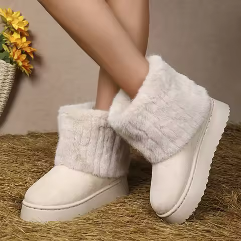 Fashion Women Round Toe Warm Thickened Plush Winter Beige Mid-calf Boots Thick Sole Casual Comfortable Anti-slip Women Snow Boot