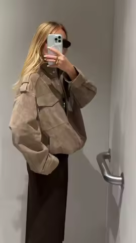 Casual Short Suede Jacket Women Fashion Chic Stand Collar Zipper Pocket Loose Outerwear Lady Autumn New Daily Highstreet Jackets