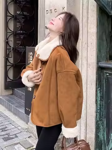 Y2K imitation sherpa jacket for women warm winter street retro Korean style casual loose long-sleeved single-breasted jacket