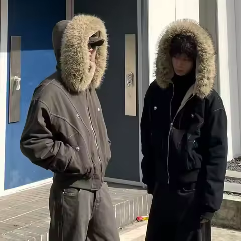 American Street Fur Collar Zipper Hooded Jacket Women Autumn Winter Retro New Velvet Thickened Warm Fashion Loose Casual Jacket