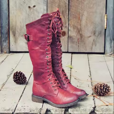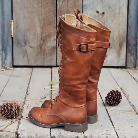 Women Knee high Boots Autumn Winter Lace Up Flat Shoes Sexy Steampunk PU Retro Buckle women shoes Ladies Snow Boots yui8