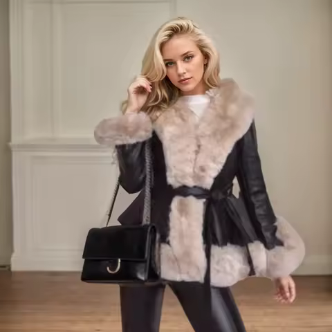 Imitation Rabbit Skin Fur Coat for Women Fashion Waist Lace Up Fur Integrated Jacket Winter Warmth Slim Fit Pu Leather Jackets