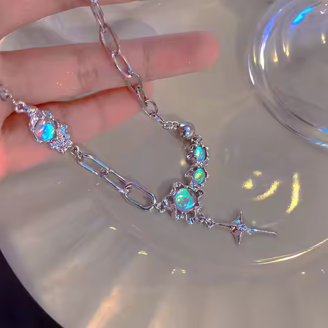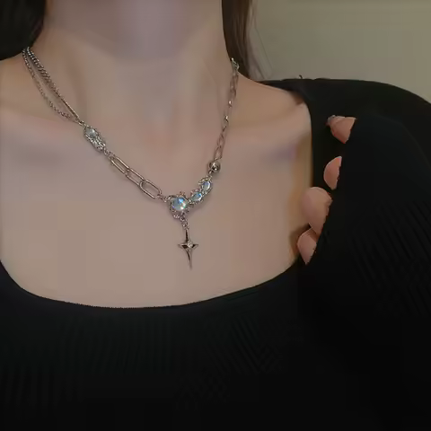 JWER Trendy Bling Moonstone Star Cross Pendant Necklace for Women Punk Hip Hop Star Chain CrystalNecklace Party Y2K Jewelry Gift