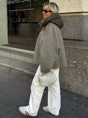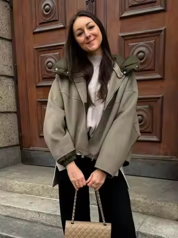 Hooded Woolen Jacket Coat Large Pocket Metal Button Commute Women Short Overcoat Contrast Color Outwear Loose Casual Blouse