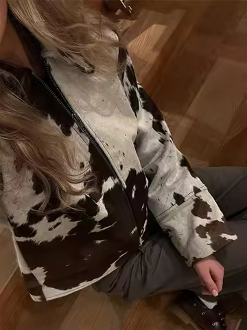 Elegant Print Short Jacket Women Retro Lapel Zippers Long Flare Sleeve Female Outwear 2025 Autumn Fashion Lady Streetwear