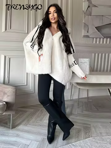 Hooded Patchwork Zipper Oversized Bomber Jacket Women Elegant Furry Full Sleeve Loose Fitting Autumn Winter Coats New Outerwear