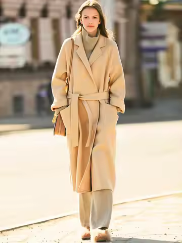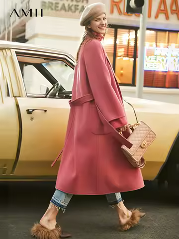 AMII Minimalist Wool Coat For Women 2024 Winter Blazer Collar With Belt Vintage Korean Fashion Long Blends Jacket 12324006