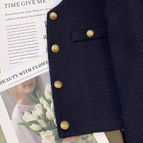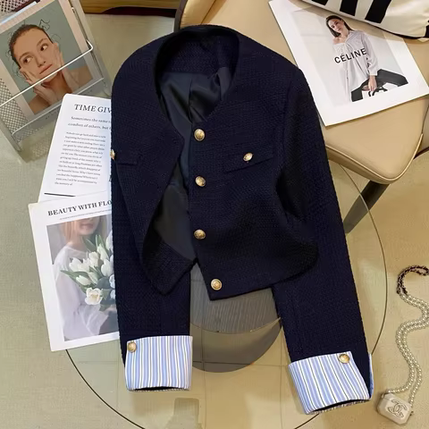 Navy Nlue Small Fragrant style Suit Jacket For women Spring autumn 2025 New Round neck French Fashion Splicing Design Short Top