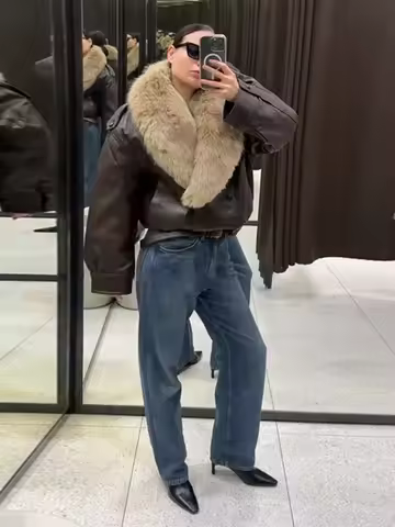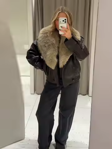 Fashion PU Leather Short Jacket Women Fur Collar Contrast Double-breasted Warm Coat Female 2025 Autumn Winter New Outwears
