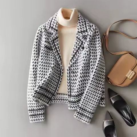 Jackets Women's Autumn Winter 2025 New Small Fragrance Short Coat Female Style Vintage Houndstooth Knitted Cardigan Outwear Tops