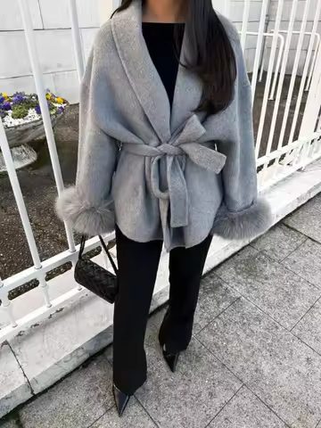 Grey Lace Up Faux Fur Sleeve Jacket Luxury Women's Mid-length V-neck Woolen Blend Coat Autumn Casual Fashion Scarf Outwear 2025