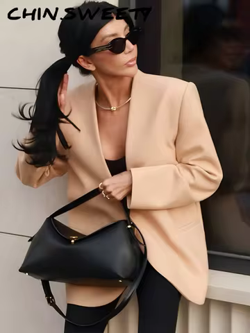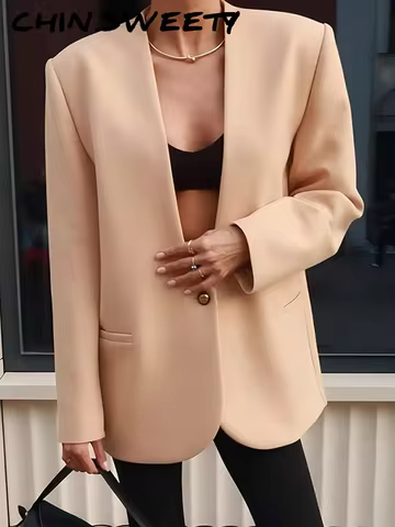 Elegant Solid V-neck Women Blazer Urban All-match Long Sleeve Button Pocket Female Coat 2025 Spring Autumn Fashion Lady Jacket