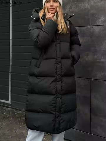 FairyShely 2026 Women Black Down Cotton Long Coat Female Casual Hooded Long Sleeve Jacket Winter Lady Zipper Warm Thick Outwear