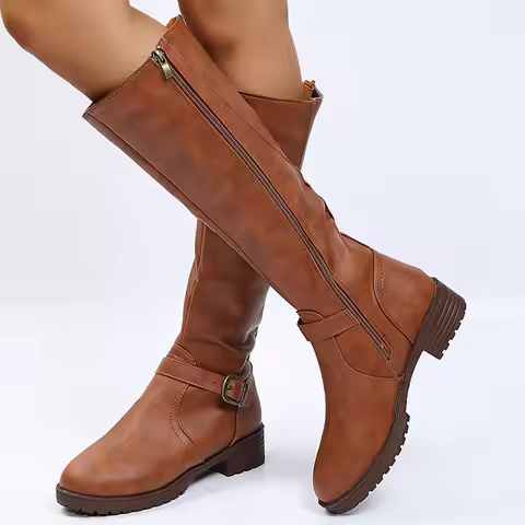 Vintage Brown Women Knee High Boots Big Size Low Heels Platform Long Boots Autumn Winter Pu Leather Zip Women Warm Booties
