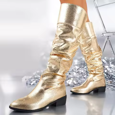 Women's Golden Slouchy Knee - High Boots 2025 New Shiny Metallic Style Pointed-toe Leather Shoes Fashion Western Cowboy Boot