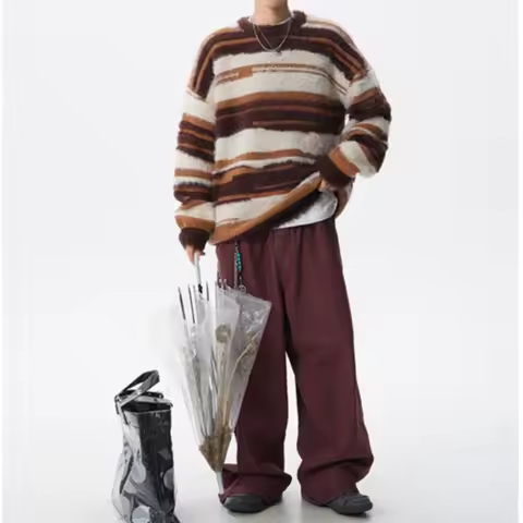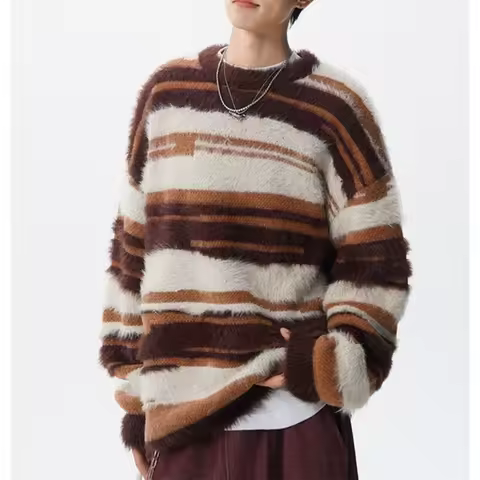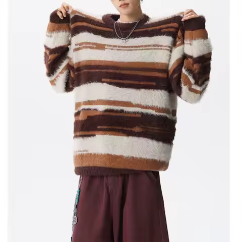 Men's Fashion Fuzzy Striped Sweater Casual Loose Warm Knit Pullover Top for Autumn Winter Streetwear