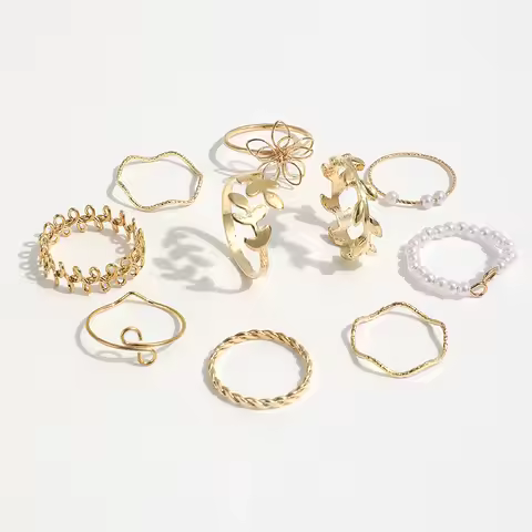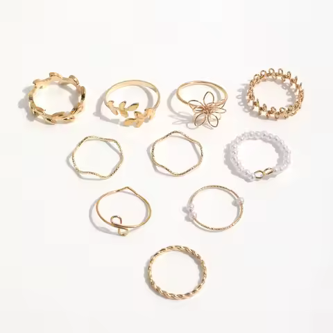 Bohemian Hollow Flower Ring Set Glossy Leaf Vine Design Imitation Pearl Jewelry 1Set Stackable Set Boho Birthdday Gift