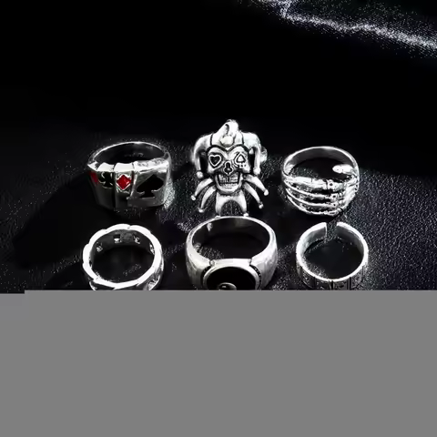 6Pcs Punk Poker Joker Silver Color Rings Set for Men Goth Skeleton Billiards Set Couple Emo Fashion Jewelry Anillos Hombre