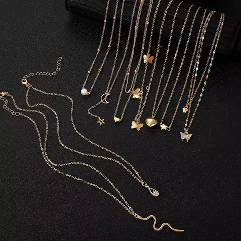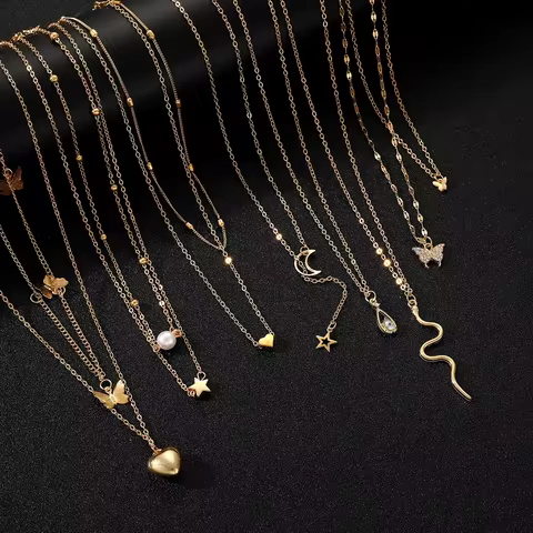 9 Pcs Multi-layered Gold Color Necklace Set for Women Fashion Zircon Pearl Heart Butterfly Star Moon Snake Pendant Necklaces Set