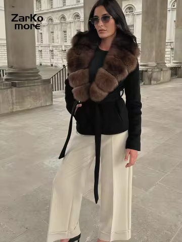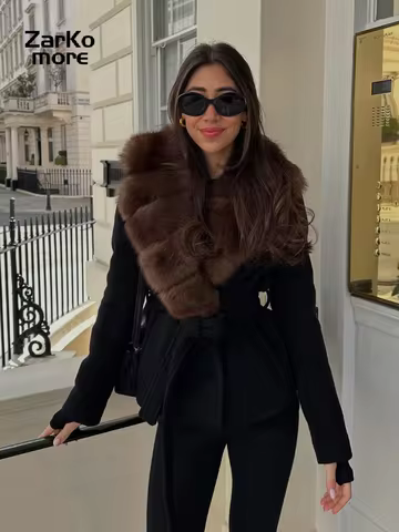 Fashion Fur Spliced Lace Up Woolen Coat Women Lapel Full Sleeve Belt Chic Jacket 2025 Autumn Winter Lady Warm Outwears New