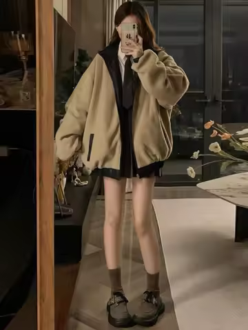 Maillard Fashion PU Leather Jacket With Lambswool Coat Both Sides Female Y2K Winter New Velvet Locomotive Cotton-padded Jacket