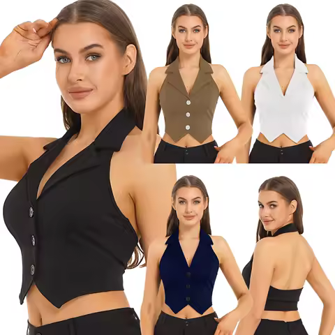 Womens Button Down Pointed Hem Waistcoat Sleeveless Vest Crop Tops Lapel Backless Tanks Camis Blazer Tops Tuxedo Jackets Coat