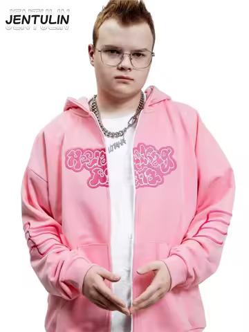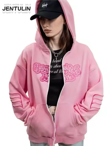 Y2K Retro zip up Hoodie Men Вата Embroidery Pink Zipper Sweatshirt Cartoon Hiphop Streetwear Oversize Korean Graphic Jacket Goth