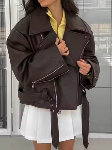 Notched Collar Belt Leather Jacket Solid Zipper Full Sleeve Short Coat Loose Coats 2025 Lady Daily High Street Fashion Jackets