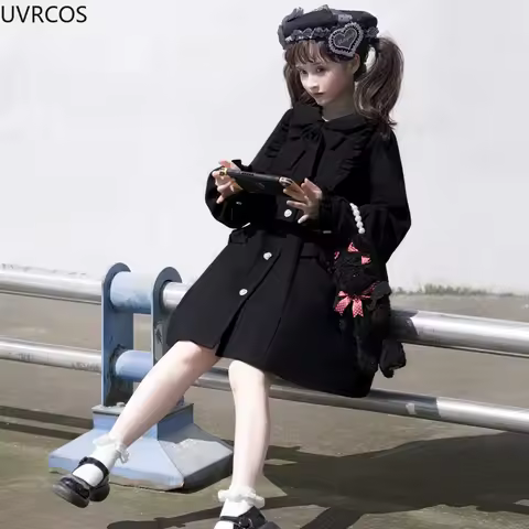 Winter Women's Woolen Coat Japanese Lolita Style Sweet Kawai Bow A-Line Loose Jackets Female Elegant Fall Korean Fashion Outwear