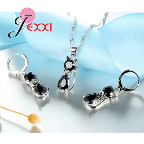 Fast Shipping Retail Romantic Engagement Silver Cute Cat Jewelry Sets Necklace Earrings With Austrian Crystal For Women
