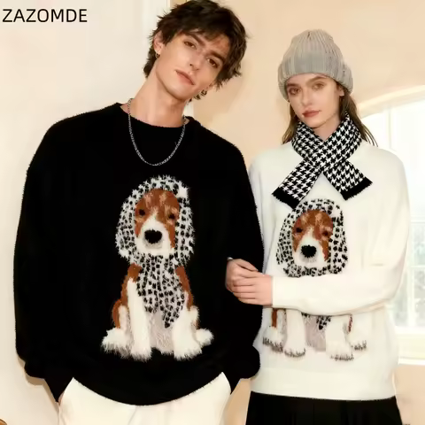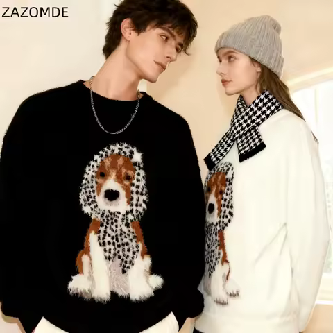 ZAZOMDE Vintage Style Couple Dog Pattern Winter Sweater Men Unisex Retro Matching Design Cozy Knit Pullover Classic Couple Wear
