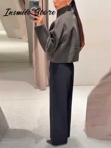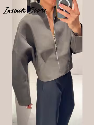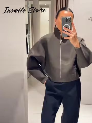 Casual Knit Stand Collar Cropped Jacket Women Loose Full Sleeve Zipper Coat 2026 Spring Autumn Lady Chic Street Outwear Winter