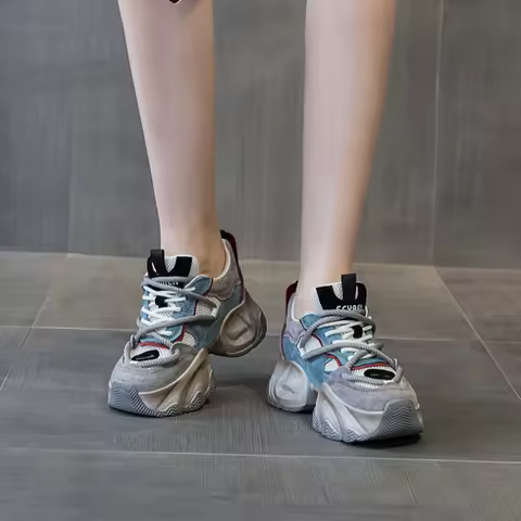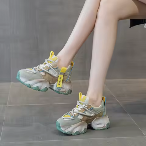 CICIYANG Chunky Sneakers Women 2026 Spring New Mesh Leather Platform Shoes Mixed Colors Lace-Up Ladies Trainers Student Shoes