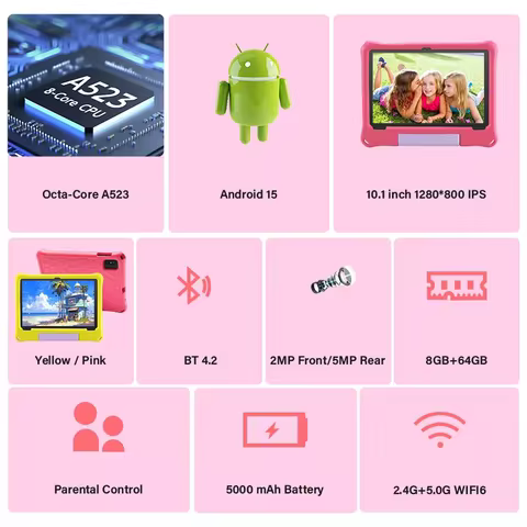 ANRY Android 15 Kids Tablet 5000Mah Octa-core 10.1 inch 8GB (4+4GB)RAM 64GB ROM Tablets Entertainment Learning Children's Tablet