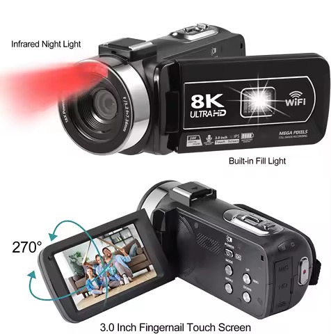 Professional 8K Video Camera Full HD 3.0 Inch 270 Degree Flip Touch Screen Camcorder with 16X 48.0 Mega Digital Vlogging Cameras