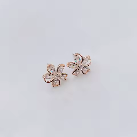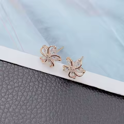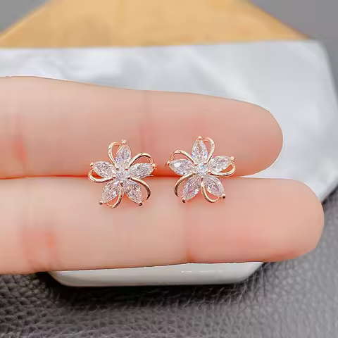 Delicate Gold Color Flower Stud Earrings with Tiny Zircon Paved Shiny Petal Earring for Women Cute Girls Lady Dangler Jewelry