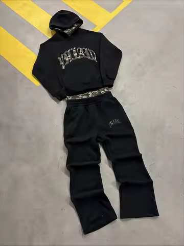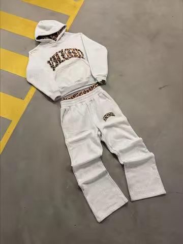 High street fashion leopard print letter embroidered men sportswear suit Y2K American casual retro hoodie trend loose clothing