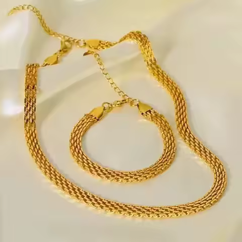 GANEMLY 316L Stainless Steel Metal Wide Chain Necklace Bracelets Waterproof Jewelry Set Gold Color Chain Charm Jewelry Set Gift