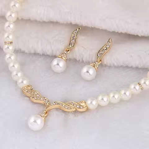 Creative Gold Color Necklace + 1 Pair Earrings Wedding Bridal Pearl Jewelry Set For Women Lady Female