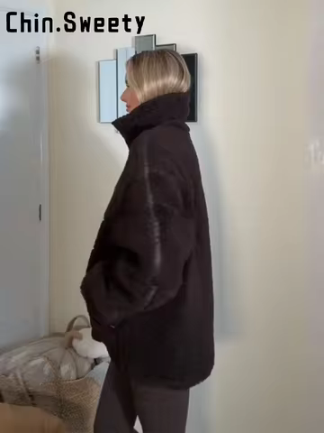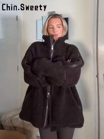 Fashion Teddy Velvet Ziper Jacket Women Loose Stand Collar Street Warm Jackets Female 2025 Autumn Winter Lady Chic Outwear New