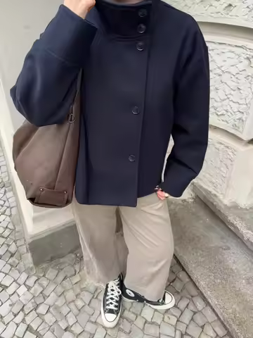 Solid Woolen Blend Casual Coat Women Stand Collar Long Sleeve Single Breasted Fashion Jacket Autumn Lady High Street New Outwear